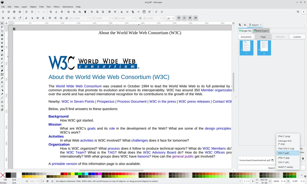 press the control key, shift key, and e key on your keyboard simultanously (ctrl+shift+e). the export panel opens on the right side in inkscape. click on Page in the top right area. now click on the selection box over Export in the bottom right corner (it probably says PNG (*.png) ). select PDF (*.pdf) (you may have to scroll down a bit). now inkscape exports your document as redacted pdf. enjoy!